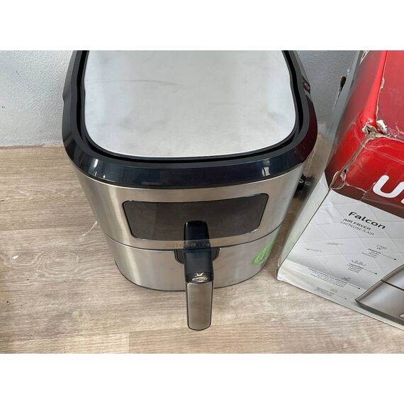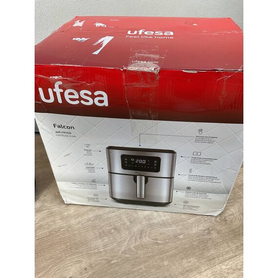 Freidora de Aire Ufesa Falcon de 6.5L (como nueva, pequeña rotura en carcasa externa que no afecta funcionamiento). Tecnología Air Pulse, 1700W, con 8 programas y rango de temperatura de 80ºC a 200ºC. Fabricada en acero inoxidable, sin BPA ni PFOA y con superficie antiadherente.