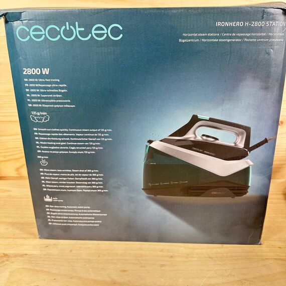 Centro de Planchado Horizontal Cecotec IronHero H-2800 Station de 2800W (como nuevo, sin defectos). Ofrece un potente vapor de 135g/m y un golpe de vapor de 360g/m. Su suela cerámica garantiza un deslizamiento óptimo y cuenta con sistema antical, auto off, precisión y ajuste de temperatura.