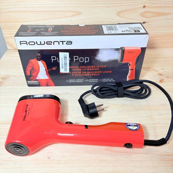 Rowenta Pure Pop DR2022, cepillo de vapor de 1300 W en estado como nuevo y sin defectos. Ofrece una salida de vapor de hasta 20 gr/min, ideal para planchar y purificar tejidos, eliminando pelusas y pelo. Cuenta con cabezales reversibles y un diseño compacto perfecto para viajar.