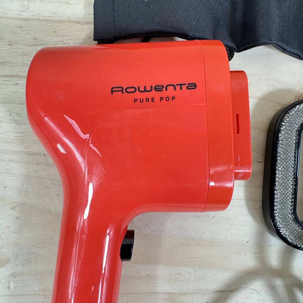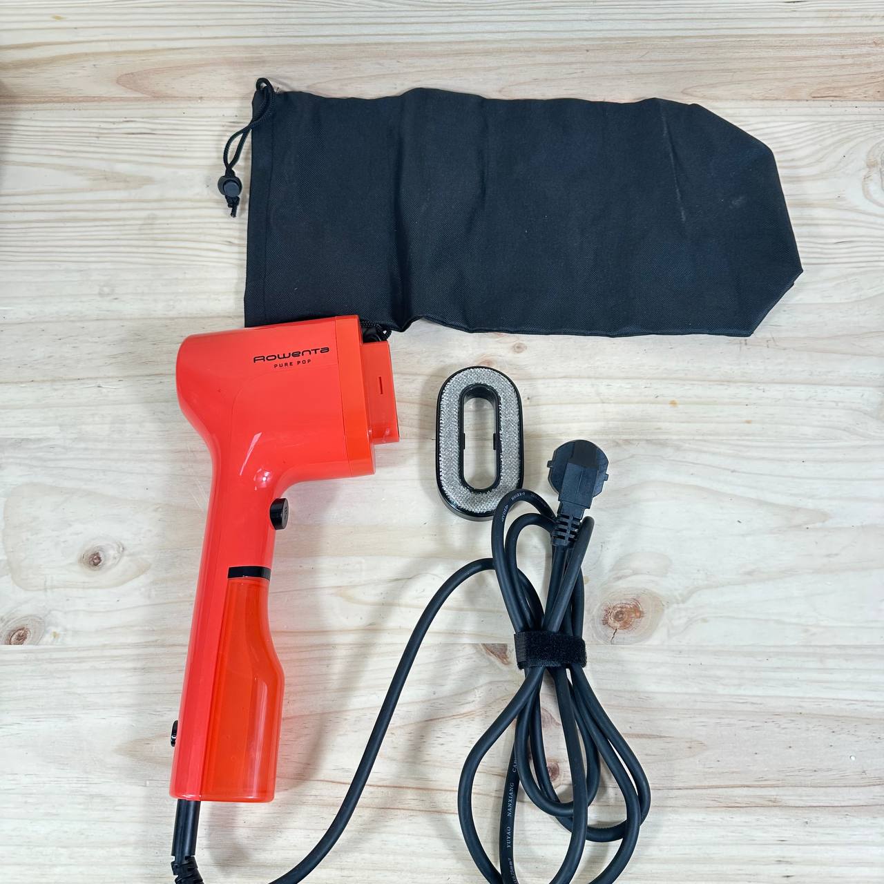 Rowenta Pure Pop DR2022, cepillo de vapor de 1300W (buen estado, pequeño detalle: falta caja original). Ofrece una salida de vapor de hasta 20 gr/min, ideal para planchar y purificar prendas, además de eliminar pelusas y pelo. Cuenta con cabezales reversibles y un diseño compacto perfecto para viajes.