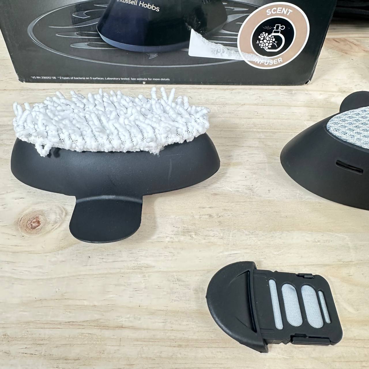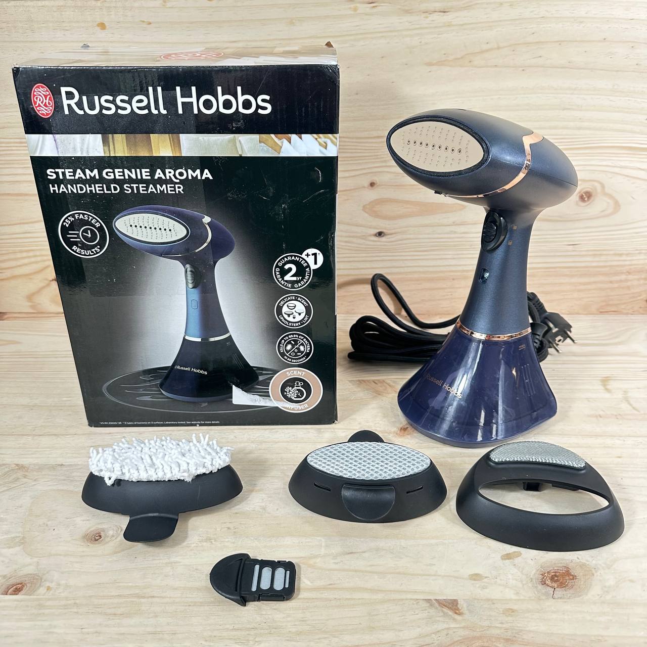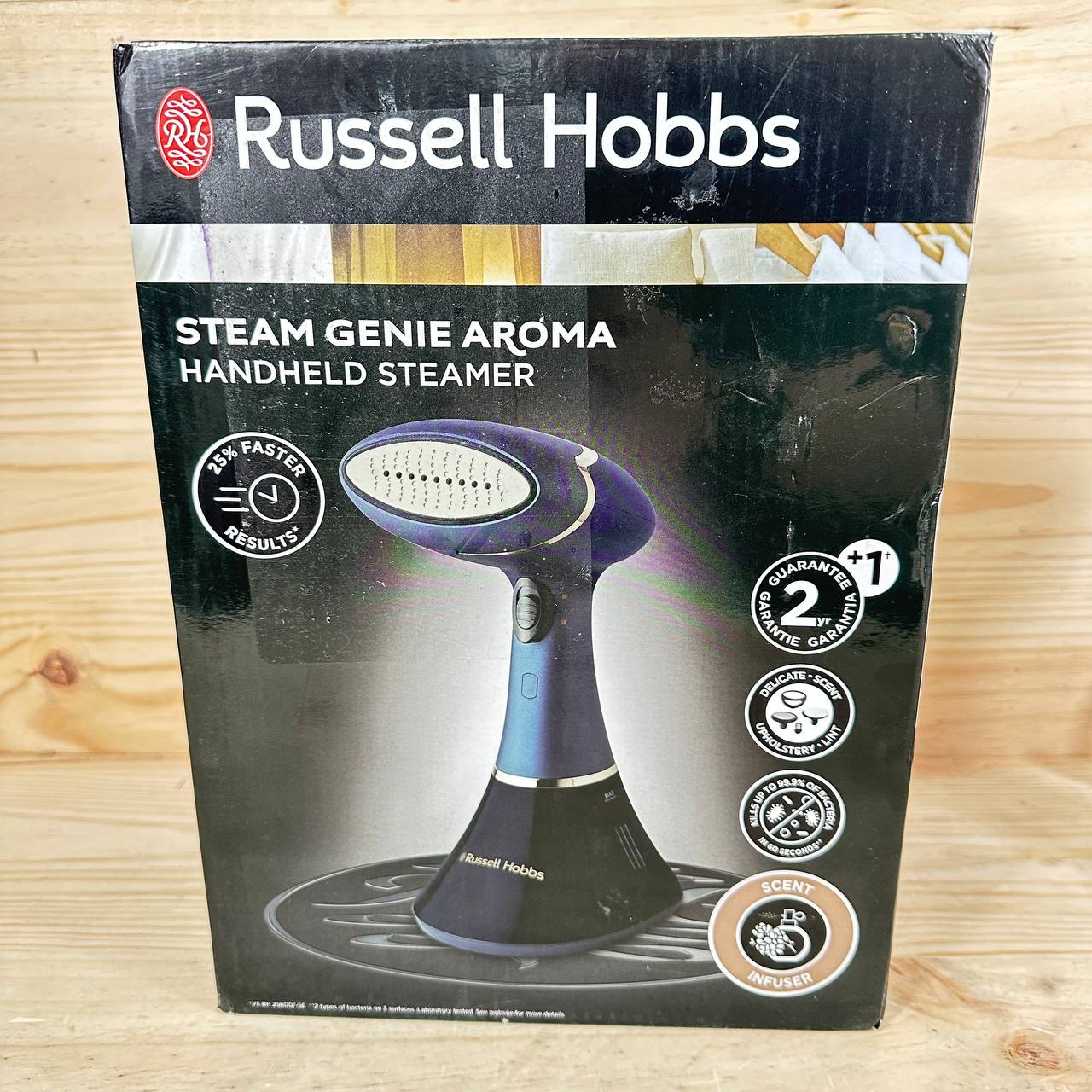 Plancha Vertical Russell Hobbs Steam Genie Aroma 1800W (como nuevo, sin defectos). Generación de vapor de 32g, suela cerámica y depósito de 200 ml. Incluye 3 accesorios y difusor de aroma para una experiencia de planchado mejorada.