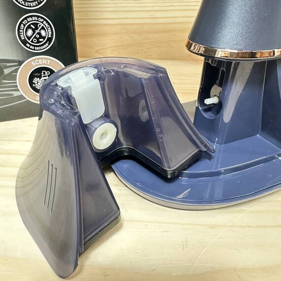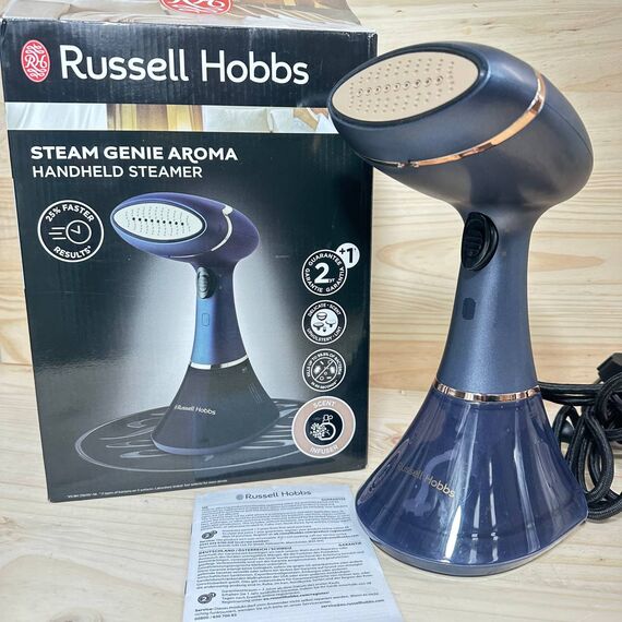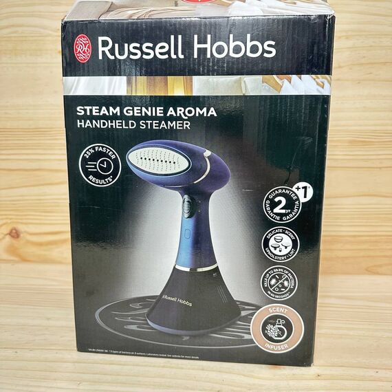 Plancha Vertical Russell Hobbs Steam Genie Aroma 1800W (como nueva, sin defectos). Genera 32g de vapor, cuenta con suela cerámica y un depósito de 200 ml. Incluye 3 accesorios y un difusor de aroma para una experiencia de planchado refrescante.