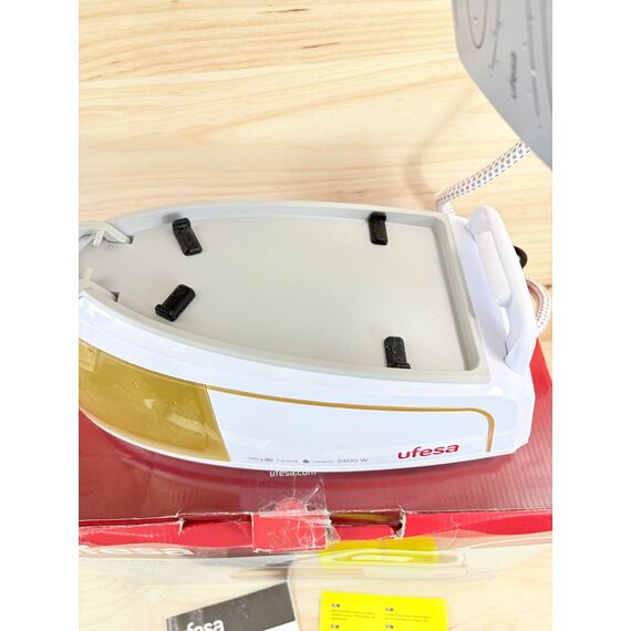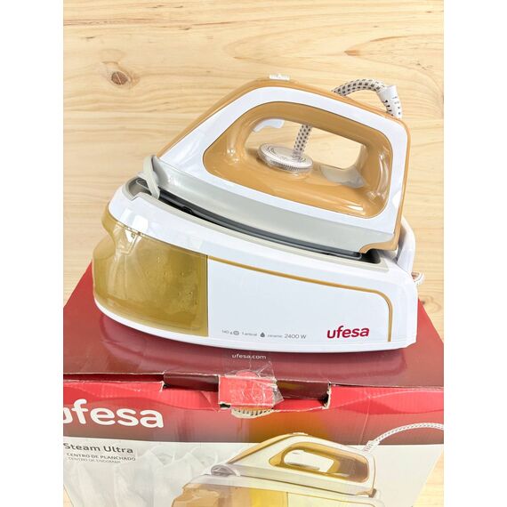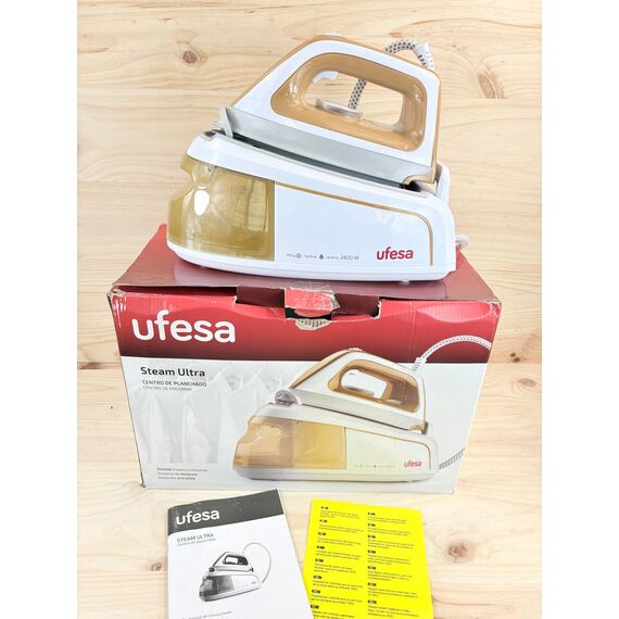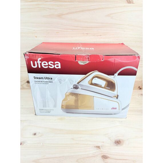 Centro de Planchado Ufesa Steam Ultra de 2400W (como nuevo, sin defectos). Cuenta con una presión de 4 bares, golpe de vapor máximo de 140g y vapor constante de 90g/min. Suela de cerámica y cartucho antical para un rendimiento óptimo.