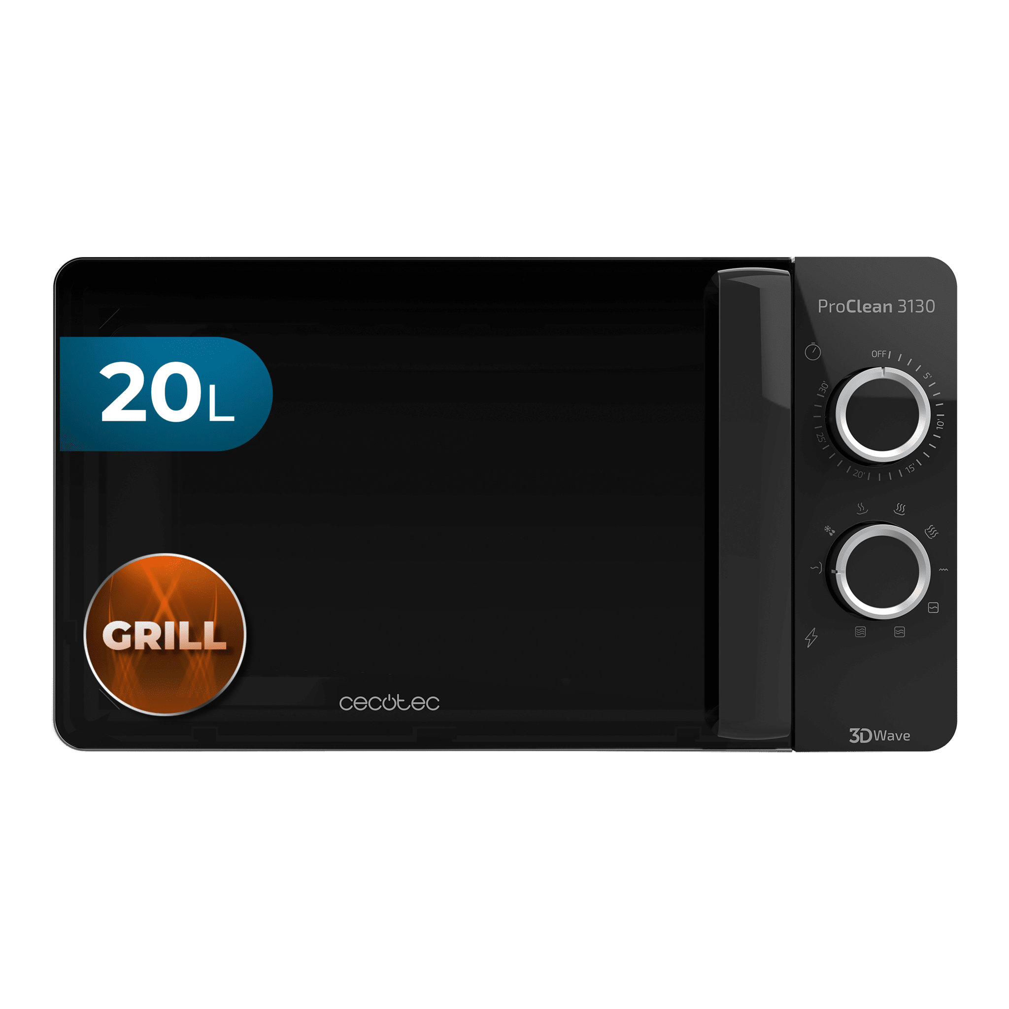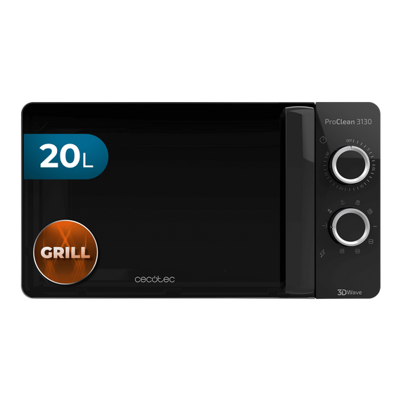 Cecotec Microondas con Grill Negro ProClean 3130. 700 W en 6 Niveles, Capacidad de 20 L, Revestimiento Ready2Clean, Tecnología 3DWave, Diseño puerta FullCrystal y Detalles metálicos