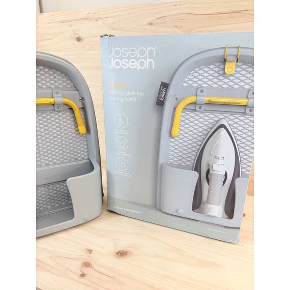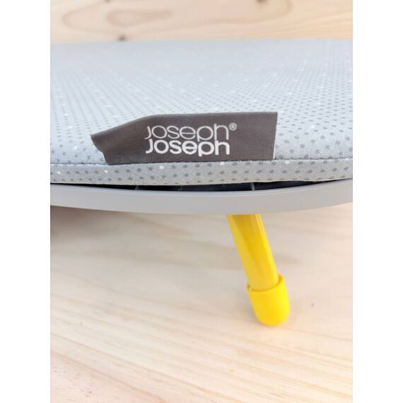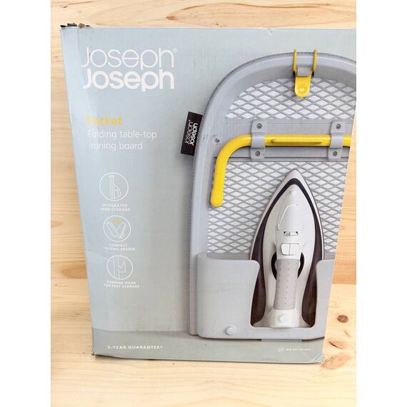 Tabla de Planchar Plegable Compacta Joseph Joseph Pocket (nuevo, ligero defecto de fabricación, caja original dañada). Dimensiones de 90x33 cm, en color gris y amarillo, ideal para espacios reducidos.