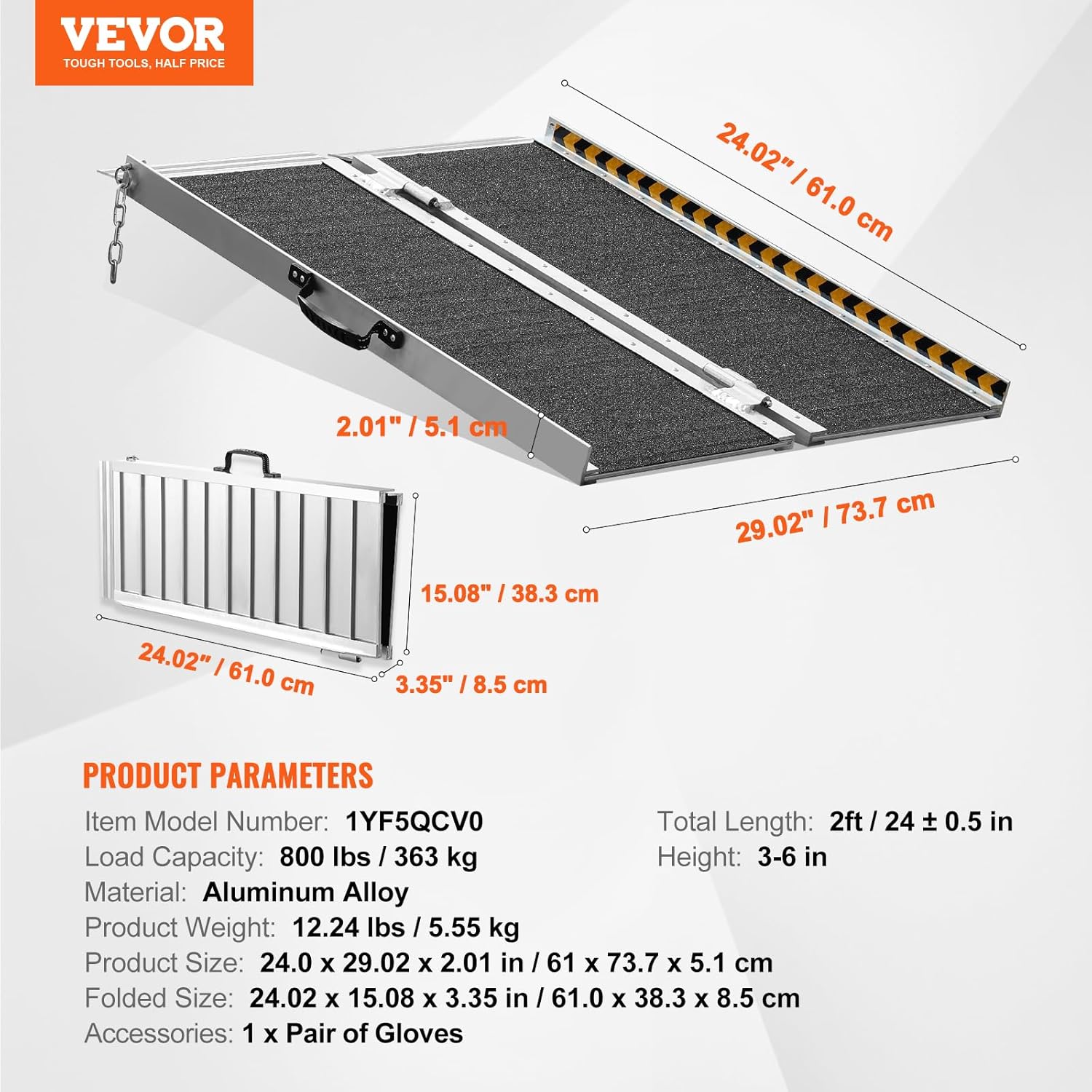 Rampa para silla de ruedas VEVOR, modelo plegable portátil de 24 pulgadas (nuevo, ligeras rozaduras). Capacidad de 800 libras, fabricada en aluminio antideslizante, ideal para facilitar el acceso a escalones y puertas.