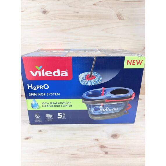 Vileda H2PrO Spin Mop Set con cubo (nuevo, pequeñas marcas de prueba que no afectan funcionamiento). Sistema innovador de dos tanques que separa el agua limpia de la sucia, con función de escurrido fácil.