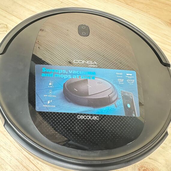 Cecotec Robot Aspirador y Fregasuelos Conga 1990 Connected (como nuevo, sin defectos). Dispositivo 4 en 1 con una potente succión de 1400 Pa y un sistema de fregado inteligente. Controlable a través de una aplicación móvil, así como con Alexa y Google Home, ofrece una autonomía de hasta 160 minutos.