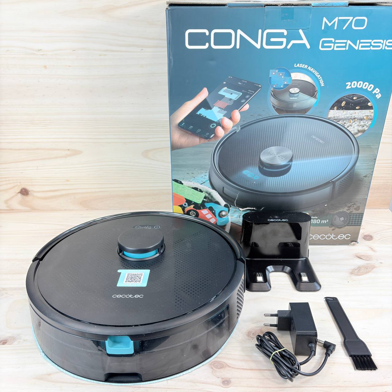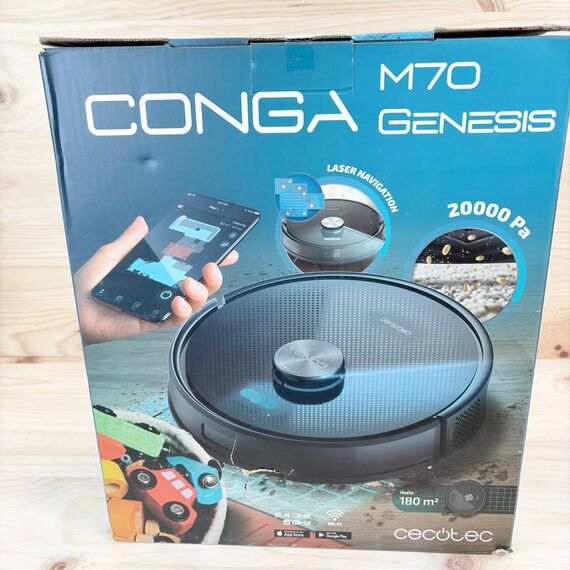 Robot Aspirador Cecotec Conga M70 Genesis (nuevo, ligeras marcas de prueba que no afectan funcionamiento). Navegación láser con motor Ungravity de 20000Pa, aspira, barre, friega y pasa la mopa. Doble depósito y cepillo de silicona que optimiza la limpieza.
