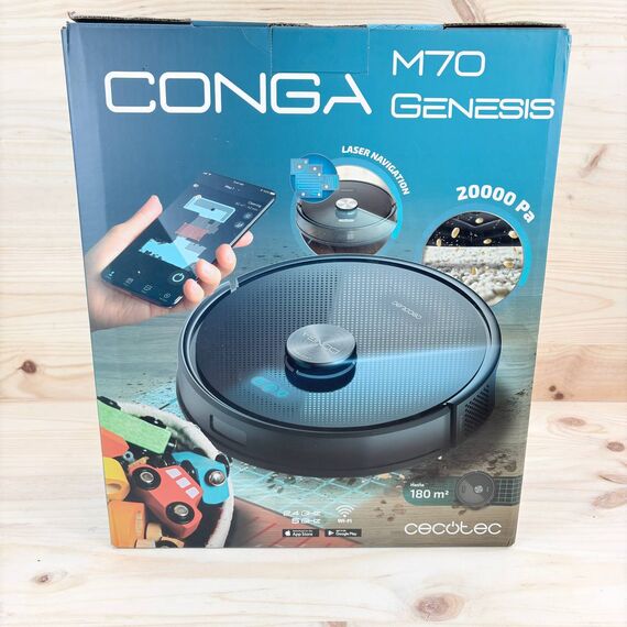 Robot Aspirador Cecotec Conga M70 Genesis (como nuevo, pequeñas señales de uso). Equipado con navegación láser y motor Ungravity de 20000Pa, este modelo aspira, barre, friega y pasa la mopa, ofreciendo una limpieza integral. Doble depósito y cepillo de silicona para una mayor eficiencia en todo tipo de superficies.