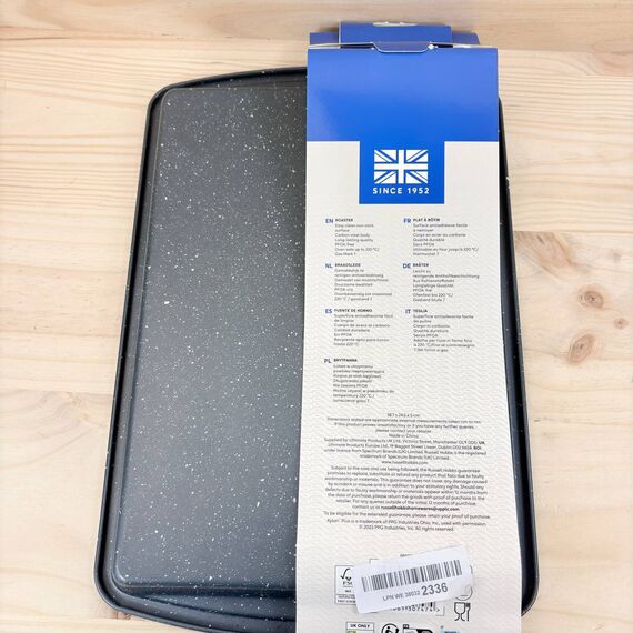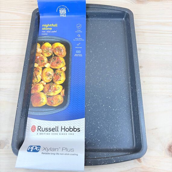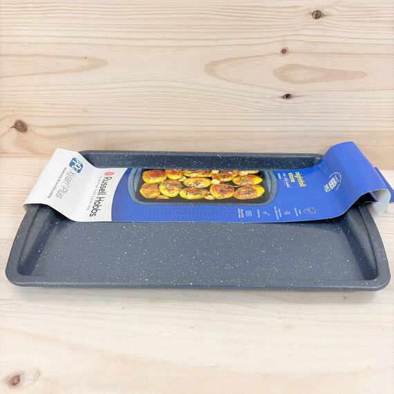 Bandeja para hornear Russell Hobbs Nightfall Stone de 38 cm (nuevo, sin defectos). Fabricada en acero al carbono con superficie antiadherente y libre de PFOA, ideal para una cocción saludable.