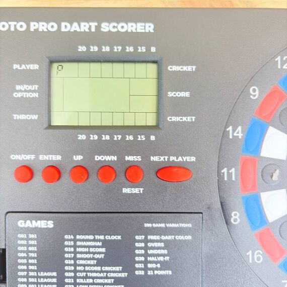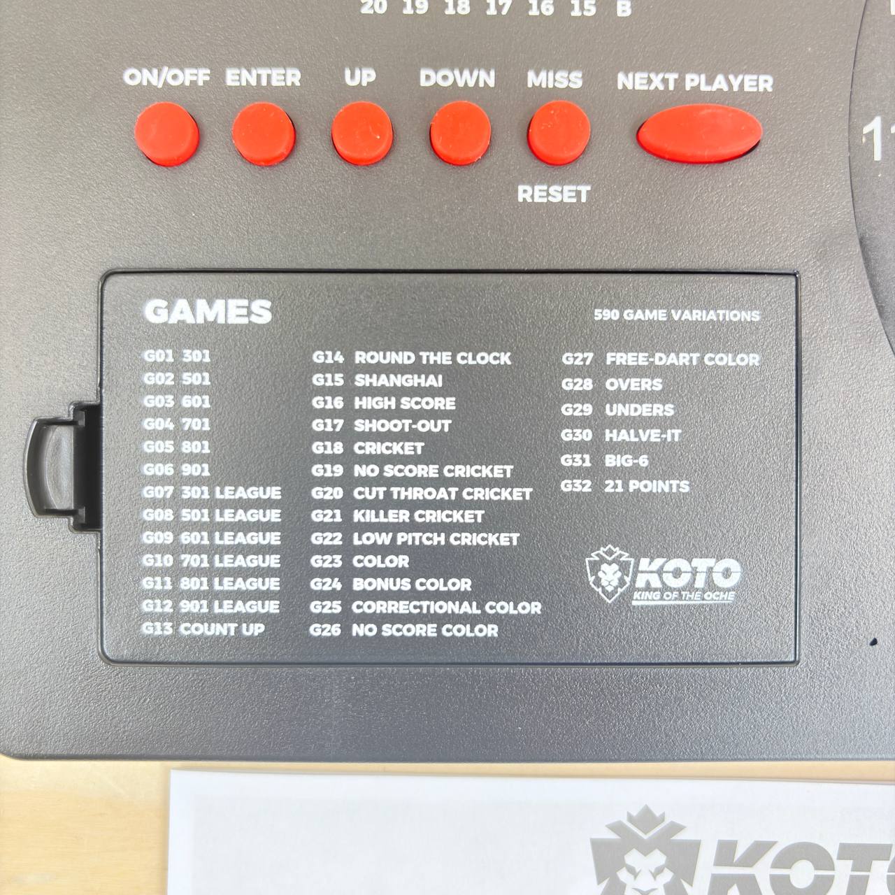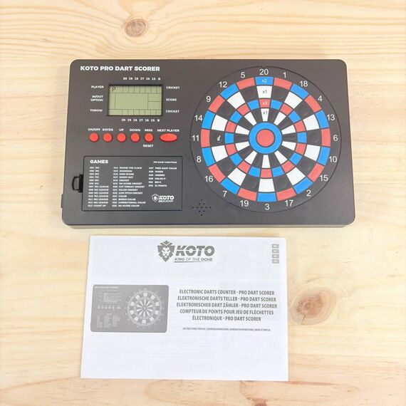 Marcador de Dardos Electrónico Pro KOTO, como nuevo, sin defectos. Cuenta con 32 juegos diferentes y una pantalla de puntuación clara, apto para hasta 8 jugadores. Su diseño permite un montaje en pared y funciona a pilas, brindando comodidad y flexibilidad en cualquier espacio.