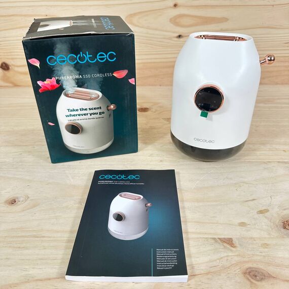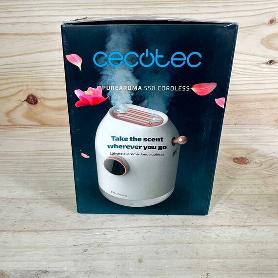 Humidificador Difusor de Aromas Cecotec PureAroma 550 Cordless (nuevo, sin defectos). Cuenta con una batería de 5000 mAh, 3 modos de funcionamiento y un depósito de 550 ml. Su diseño sin cables permite una mayor flexibilidad y comodidad, además de incluir una pantalla que facilita su uso.