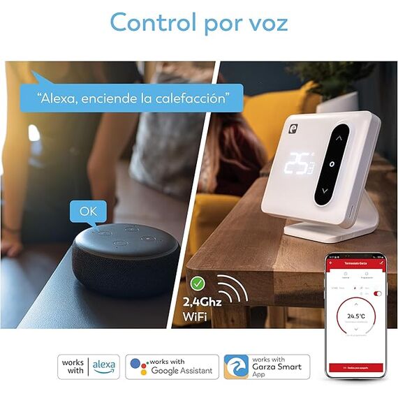 Gracias a su conectividad Wi-Fi, puedes controlarlo desde la app Garza Smart, así como mediante asistentes de voz como Alexa y Google Assistant. Su diseño compacto y pantalla clara lo hacen muy fácil de usar y configurar.