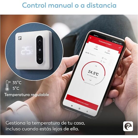 Incluye funciones de programación horaria para optimizar el consumo energético y mantener siempre el confort en casa. Puedes ajustar la temperatura a distancia, encender o apagar la calefacción incluso estando fuera y crear rutinas personalizadas según tus horarios.
