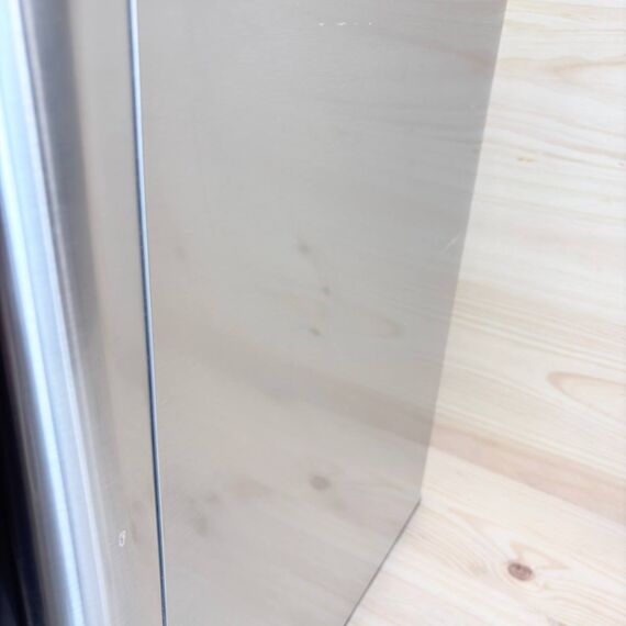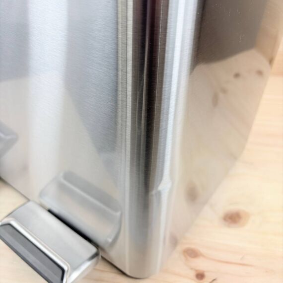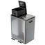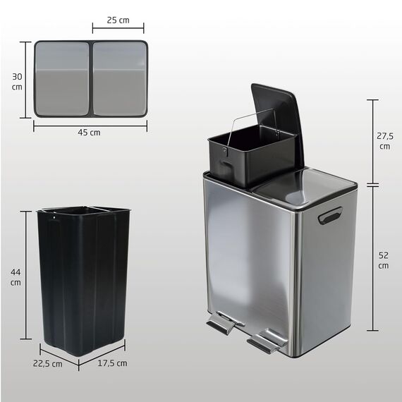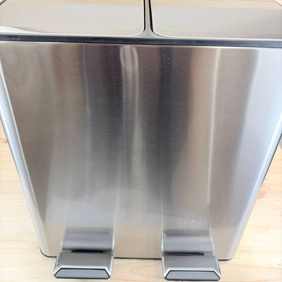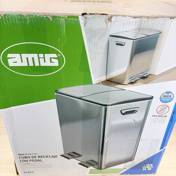 Cubo de Reciclaje Doble Amig Mod. RECIK EVO de 40L (nuevo, pequeño golpe en esquina que no afecta funcionamiento). Cuenta con dos compartimentos de 20L cada uno, fabricado en acero inoxidable, con dimensiones de 45 x 30 x 52 cm.