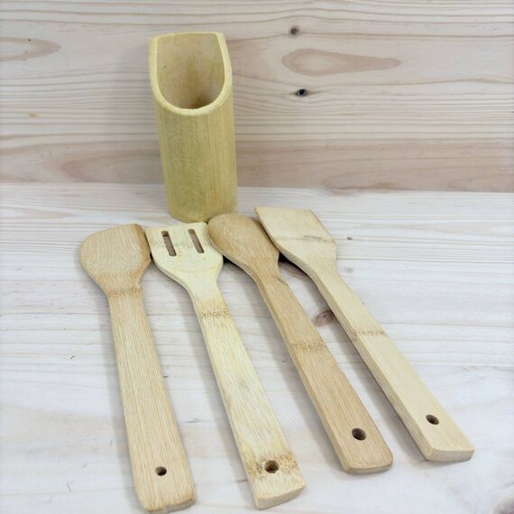 Juego de Utensilios de Cocina de Bambú, Set de 5 Piezas con Soporte (nuevo, sin defectos). Incluye cucharas y espátulas de madera natural, ideales para todo tipo de cocciones.