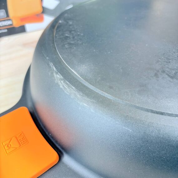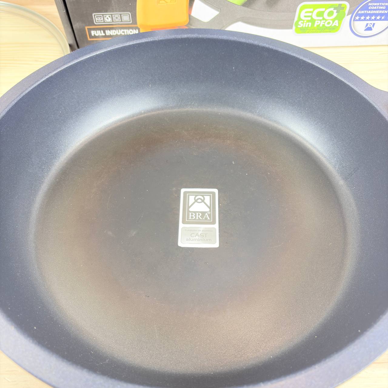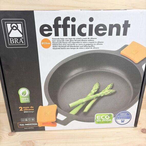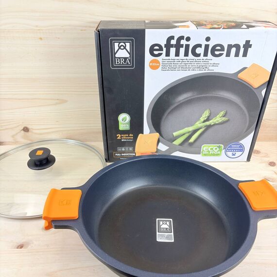 Cacerola baja BRA Efficient de 32 cm (como nueva, pequeño detalle: marca de uso). Fabricada con materiales de alta calidad, cuenta con tapa de cristal y asas de silicona extraíbles, apta para todo tipo de cocinas, incluida inducción y horno.