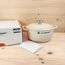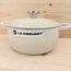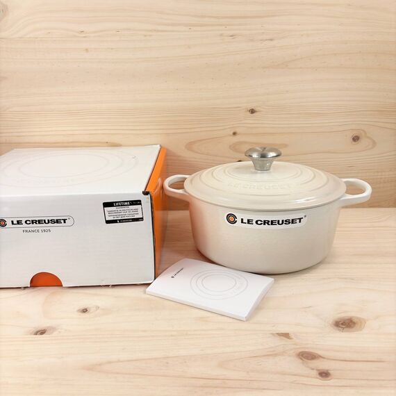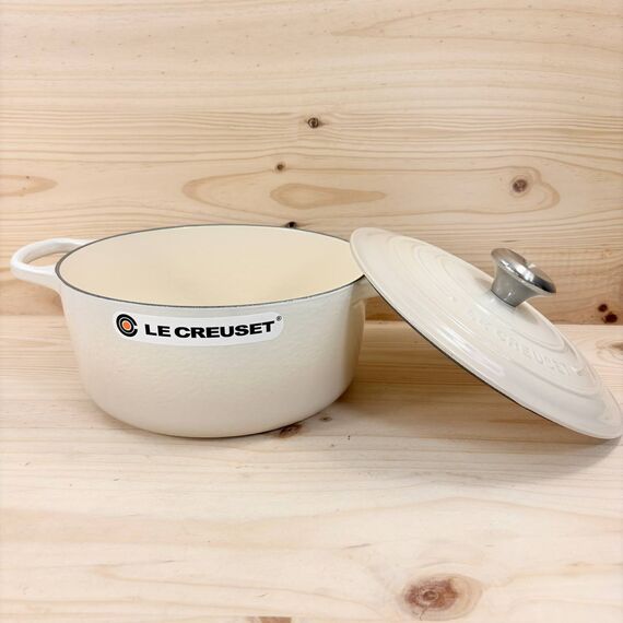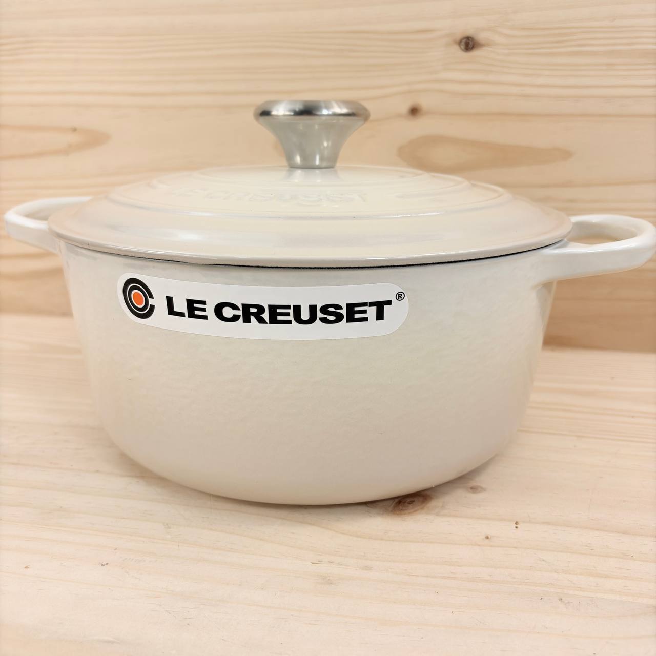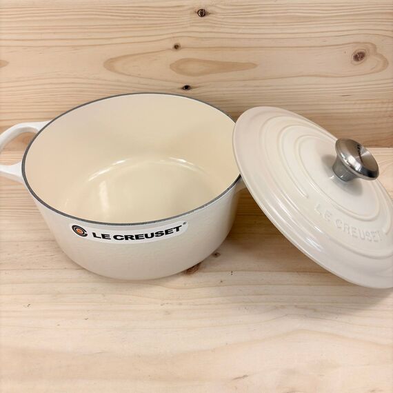 Olla de hierro fundido Le Creuset Signature, modelo redondo de 24 cm (nuevo, sin defectos). Capacidad de 4,2 litros y un peso de 4,305 kg, en elegante color Meringue, ideal para todas las fuentes de calor, incluidas las de inducción.
