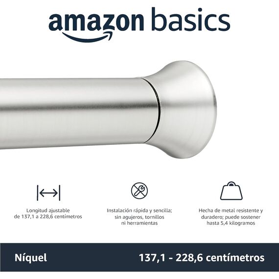 Tringle de ducha extensible y ajustable Amazon Basics, modelo en níquel, de 137 a 229 cm (nuevo, pequeño detalle: sin embalaje original). Ideal para cualquier baño moderno y funcional.
