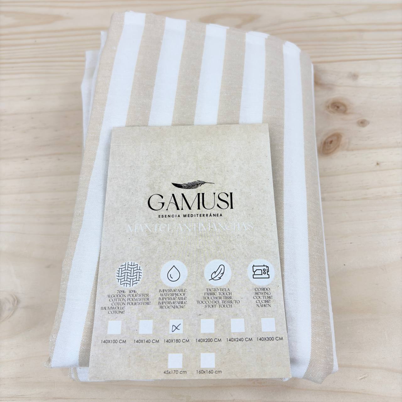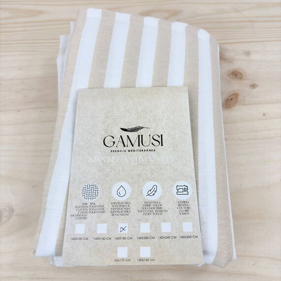 Mantel Antimanchas Rectangular GAMUSI de Tela de algodón Impermeable, dimensiones 140x180 cm (nuevo, pequeño detalle: la aguja se movió). Diseño elegante en rayas beige, ideal para cualquier ocasión.