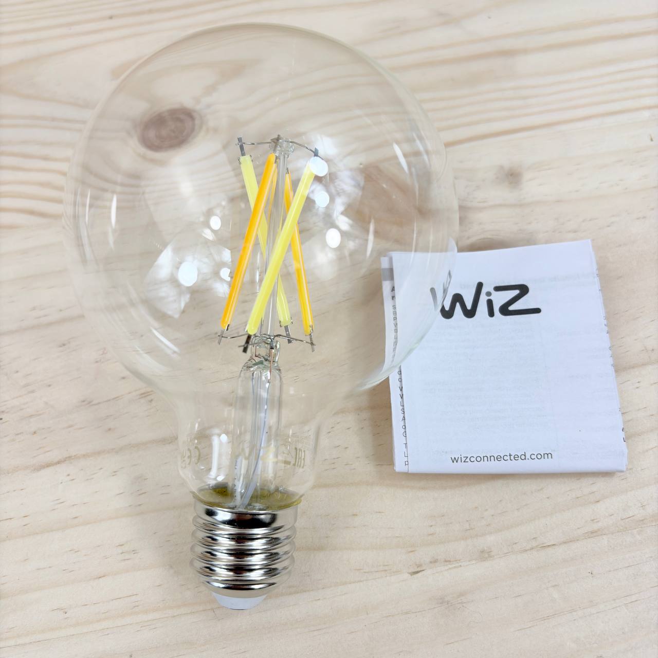 Lampara LED WiZ Tunable White, modelo Globe E27 de 60W (nuevo, sin defectos). Diseño vintage transparente, regulable y con temperatura de color ajustable desde cálido a frío.