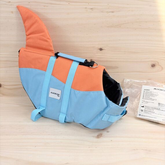 Chaleco Salvavidas Mobiclinic® Sharky para Perros (buen estado, pequeño detalle: pequeñas manchas). Diseño en forma de aleta de tiburón, ligero y con alta flotabilidad, ideal para actividades acuáticas.
