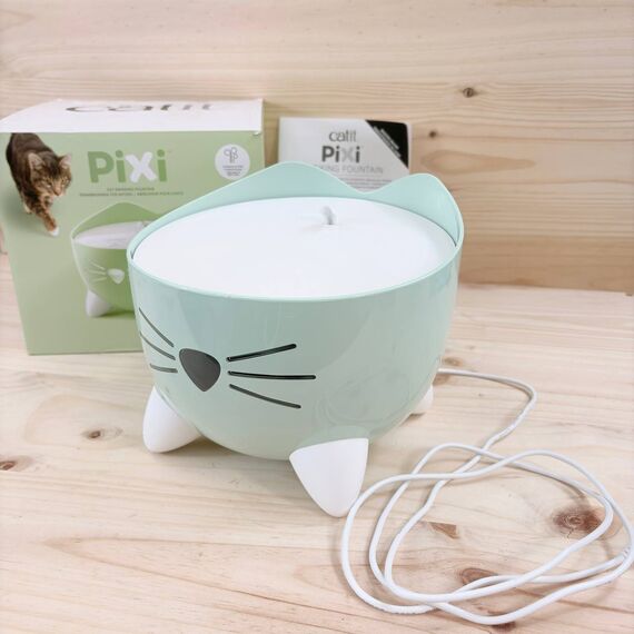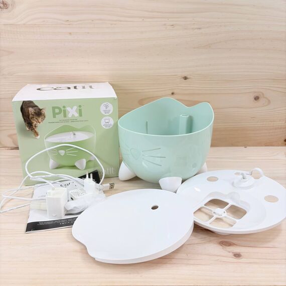 Bebedero fuente para gatos color verde (como nuevo, pequeño detalle: pequeñas manchas en la tapa). Dispone de un sistema de filtración que garantiza agua fresca y limpia, con un diseño atractivo y silencioso.