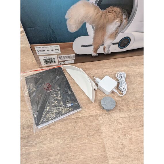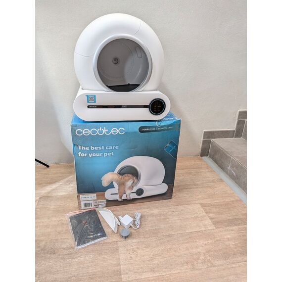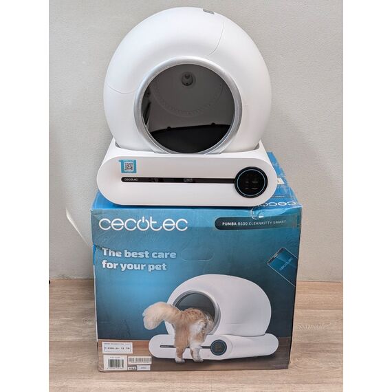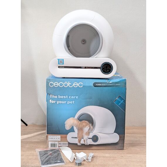 Cecotec Arenero Gatos Automático Pumba 8500 CleanKitty Smart (como nuevo, pequeño detalle: usado 1-2 veces, pequeños arañazos). Cuenta con un cubo interior de 65L y un triple sistema de desodorización, además de control por WiFi y pantalla.