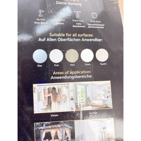 Su diseño sin taladrar permite una instalación rápida y sencilla, adaptándose a diferentes anchos. Perfecta para colgar cortinas de forma práctica y elegante.