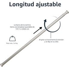 "Tringle de ducha extensible Amazon Basics. en níquel. Ajustable de 137 a 229 cm. Buen estado. sin embalaje original. Fácil de instalar y robusto para cortinas de ducha. "