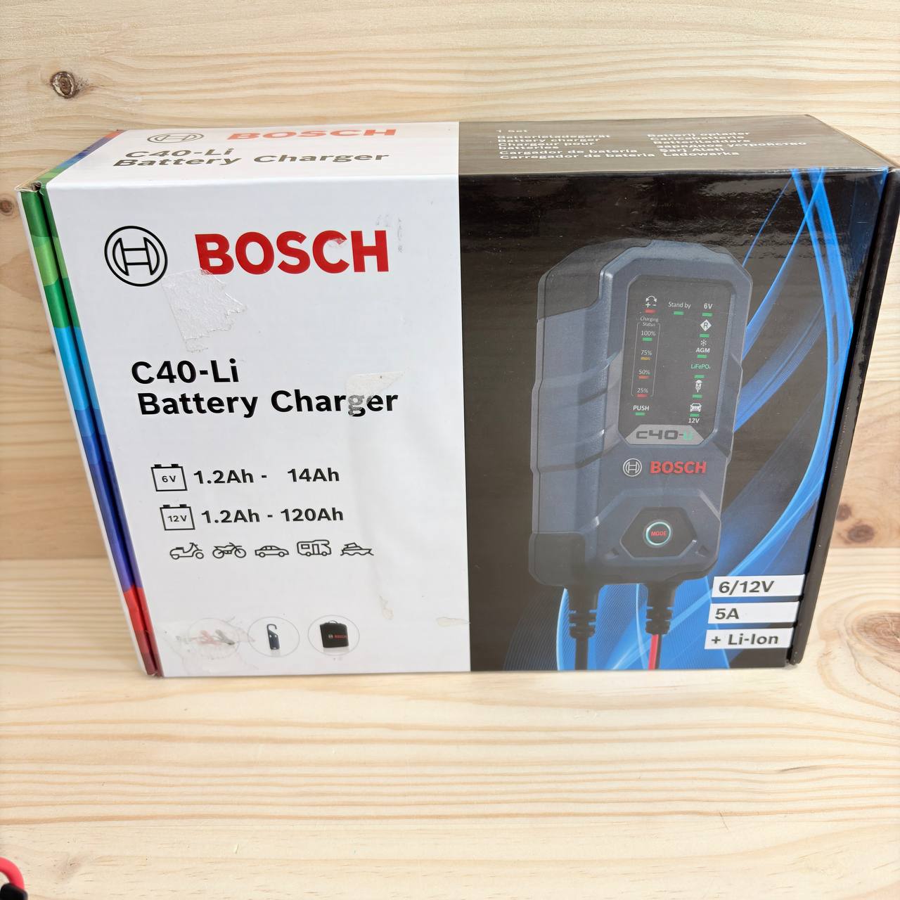 Cargador de batería de coche Bosch C40-Li de 5 Amperios (nuevo, sin defectos). Compatible con baterías de 6V y 12V, incluyendo plomo-ácido, AGM, EFB, gel, SLI y litio (LiFePO4).