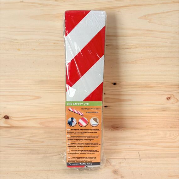 Protectoras Paragolpes de Pared Parking SNS SAFETY LTD, modelo autoadhesivo, en goma espuma, nuevo (pequeño detalle: un poco rasgado en el borde, se ve en la foto). Dimensiones de 44x10x1,5 cm, paquete de 4 piezas en color rojo y blanco.
