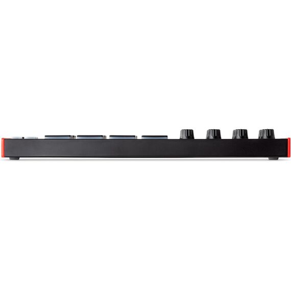 Equipa 8 pads tipo MPC sensibles a la velocidad con retroiluminación para tocar baterías, disparar samples o loops, y 8 perillas rotativas asignables para controlar parámetros de mezcla, filtros o efectos.