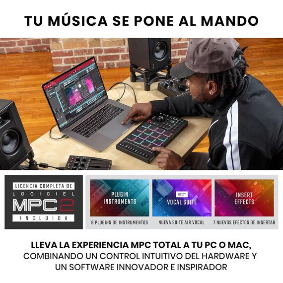 Se integra perfectamente con el software MPC 2.0 (incluido), ofreciendo un entorno completo de producción: secuenciador, sampler, efectos, instrumentos virtuales y mezcla.