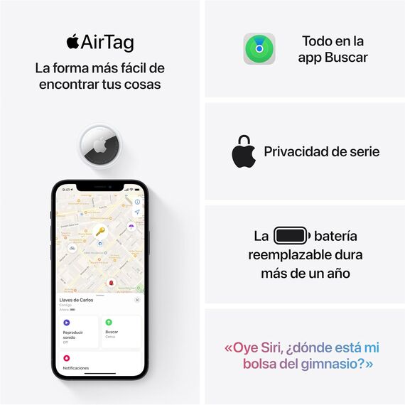 Solo tienes que enlazarlo con tu iPhone y colocarlo en tus pertenencias — llaves, cartera, maleta o incluso la mochila del colegio — para poder localizarlas cuando las pierdas.